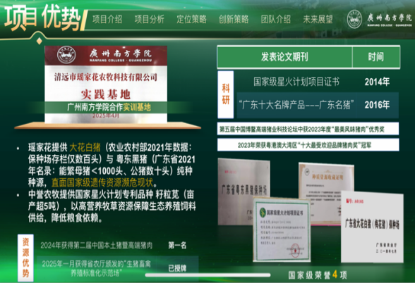 瑶家花生态农业公司是清远市农业龙头企业,专注广东梅花猪与粤东黑猪保种及产业化开发,拥有广东省畜禽遗传资源保种场资质,其产品获“广东名猪”“粤港澳大湾区十大受欢迎品牌猪肉”等称号。广州南方学院商学院近年深化产教融合,通过“三创赛”等平台推动超30个涉农项目落地,2024年获评广东省产教融合示范基地。