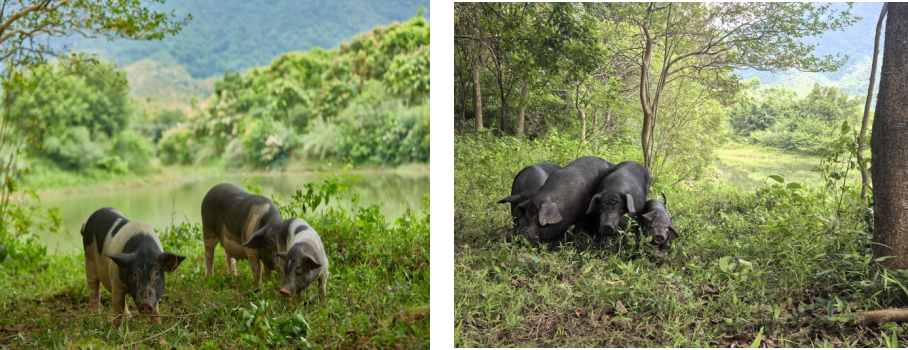 2、生态养殖:采用山地轮牧模式,实现前期圈养,后期散养的养殖模式相结合。以益生菌发酵料、牧草及地缘性农副产物喂养,养殖周期超365天;